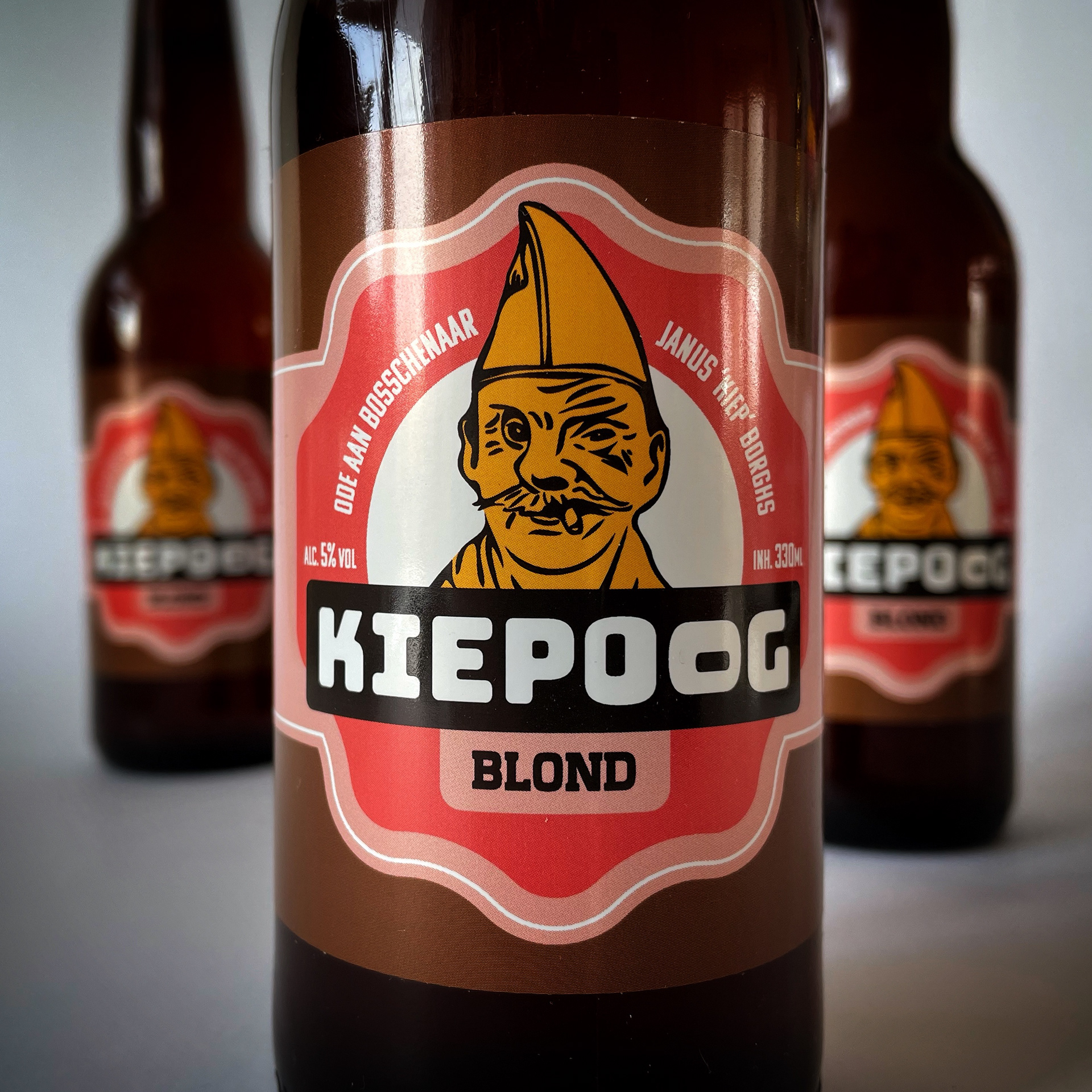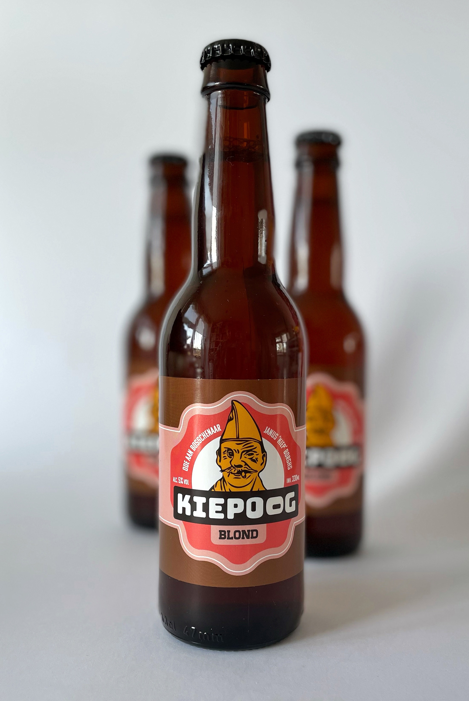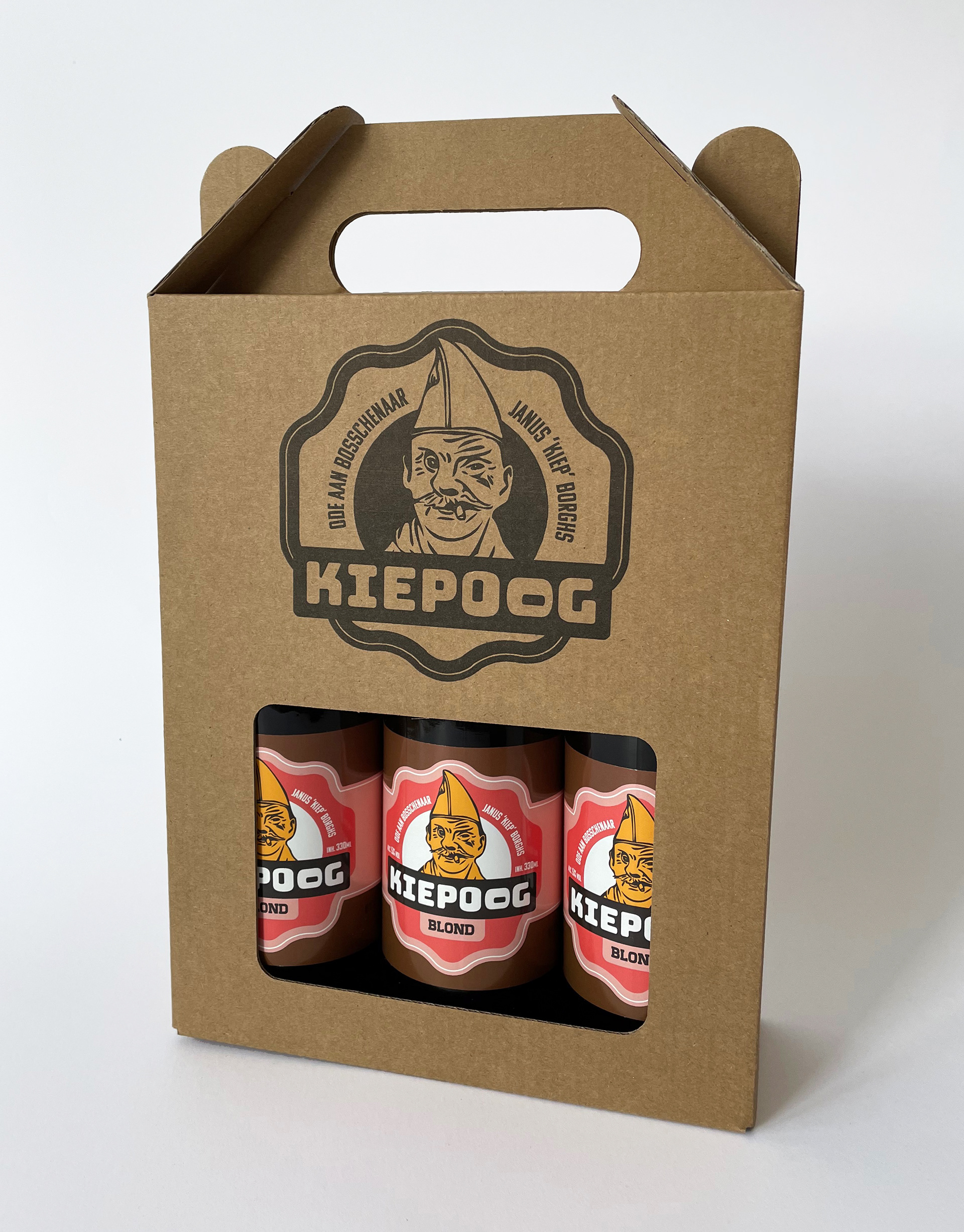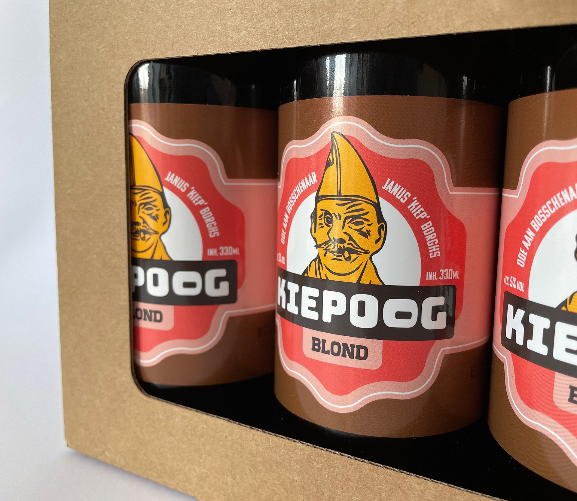 Ontwerp van een logo, etiket en cadeaubox voor Kiepoog bier voor café De Graven van Leuven.