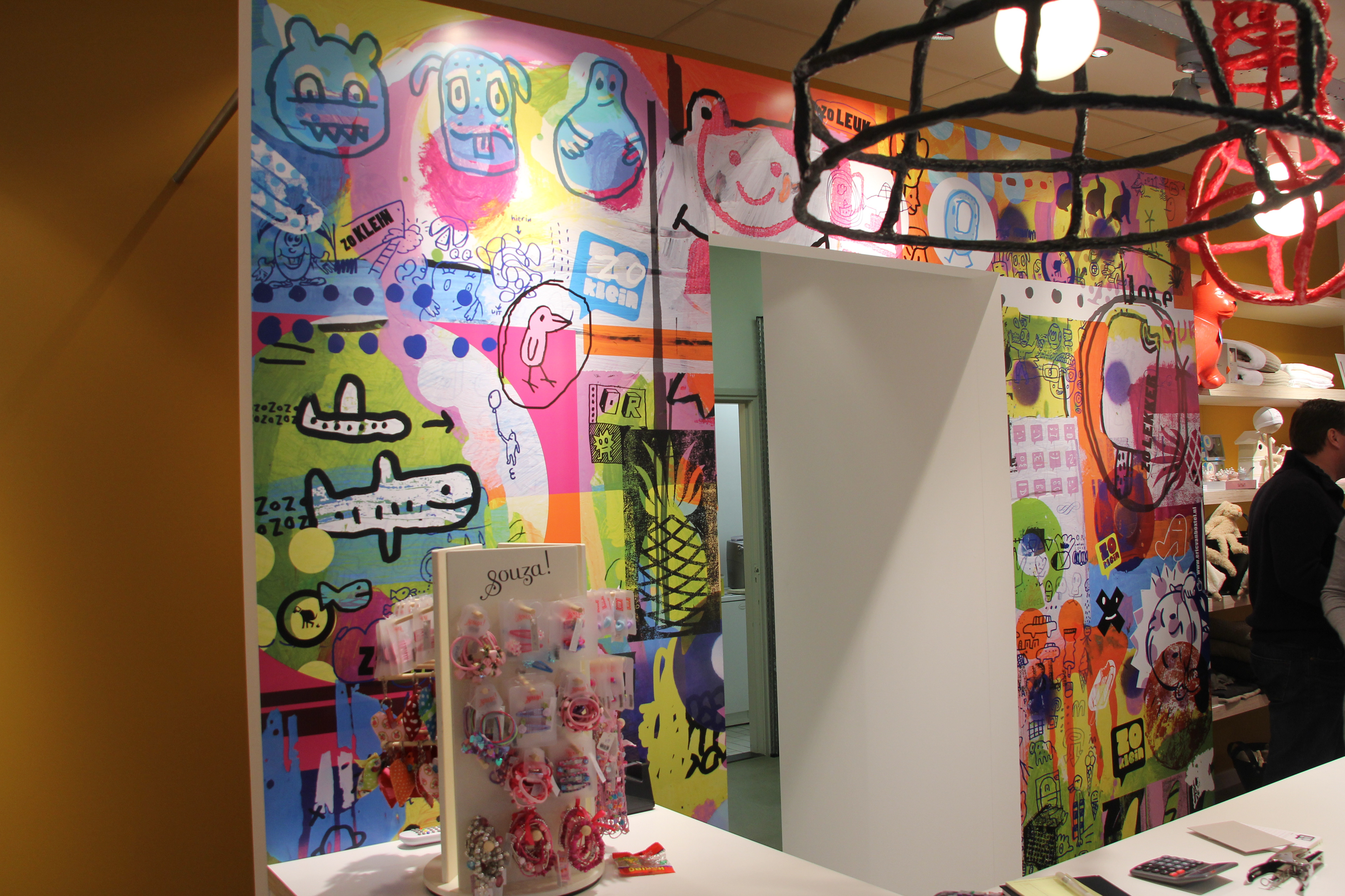 Kinderwinkel Zo Klein in Best wilde een centrale blikvanger voor de winkel. De kleurrijke kunstwand is een digitale collage van o.a. tekeningen, krabbels, schilderijdetails, grafische beelden en het logo van de winkel, aangebracht op een paneelwand van 3 x 3 meter.